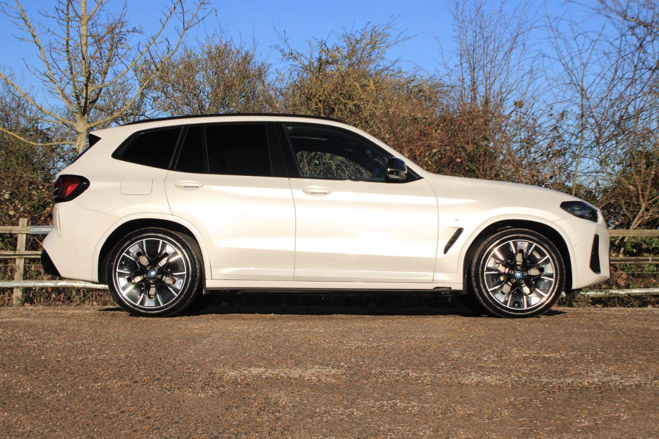 Finished in Mineral White metallic with full black Vernasca leather interior. Features include head-up display, sliding panoramic glass sunroof with powered sunblind, Harman Kardon surround sound system, comfort access with smart opener, heated steering wheel, BMW Live Cockpit Professional, Apple CarPlay and Android Auto, 20” M aerodynamic alloy wheels, parking assistant plus with surround view cameras, heated electric front sport seats with driver memory function, digital three zone climate control with automatic air conditioning, professional navigation, bluetooth connectivity with media streaming, DAB digital radio, adaptive LED headlights with high beam assistant, rain sensor, driving assistant professional, adaptive suspension, BMW Connected Services, electric folding exterior mirrors, sun protection & acoustic comfort glazing, wireless charging, extended high-gloss shadow line exterior trim, ambient lighting, BMW gesture control, BMW iconic sounds, aluminium rhombicle interior trim, roof rails, voice control, electric tailgate, multifunctional leather steering wheel, automatic transmission plus much more standard specification. This highly specified iX3 is offered in excellent condition having covered 34800 miles from new by its 1 owner. Car comes complete with a BMW service history.