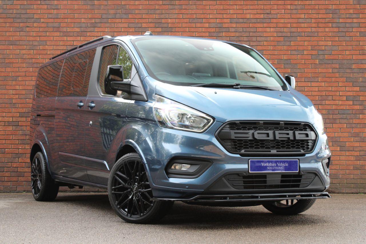 Finished in metallic blue with dark Palazzo leather interior. Features include ICE pack 25 with adaptive cruise control, SYNC satellite navigation, Apple CarPlay and Android Auto, front splitter and rear spoiler in gloss black, 20” multispoke alloy wheels finished in gloss black, front and rear park distance control with rear view camera, heated front seats with driver electric adjustment, air conditioning, 9 seats, Bluetooth connectivity with media streaming, DAB digital radio, automatic headlights with LED daytime running lights, traffic signs, lane keeping aid, drive modes, heated front windscreen, electric folding exterior mirrors, rear privacy glass, rear passenger sun blinds, driver’s armrest, roof rails, voice control, multifunctional leather steering wheel, 6 speed manual transmission plus much more standard specification. This Tourneo Custom is offered in excellent condition having covered 68900 miles from new by its 1 owner. The van comes complete with a service history. Plus VAT.