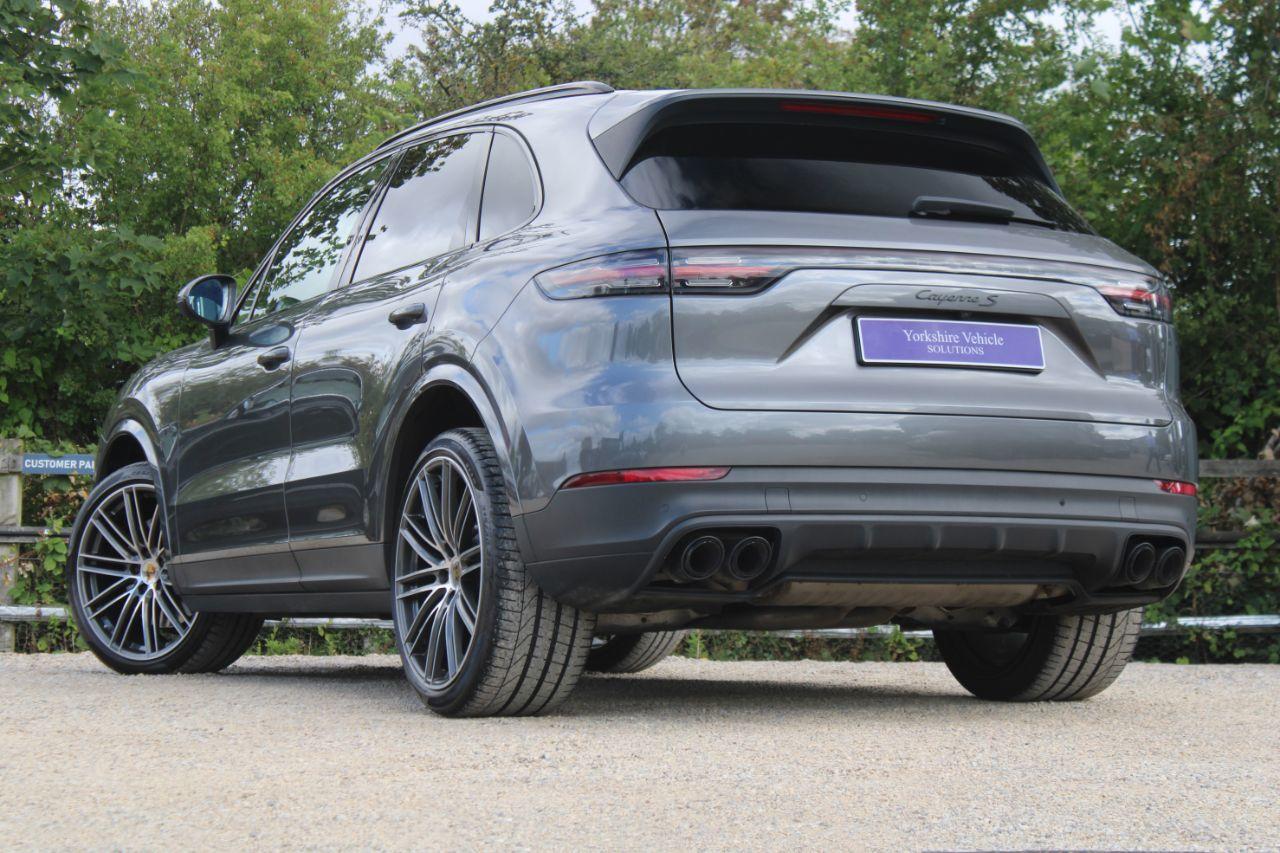 Finished in Quartzite Grey metallic (£774) with black leather interior. Features include panoramic roof system (£1422), head-up display (£1035), 22” 911 Turbo design alloy wheels with wheel arch extensions in exterior colour (£3497), 14-way electric front seats with memory package (£1137), BOSE surround sound system (£956), LED main headlights in black including Porsche Dynamic Light System (£963), sports tailpipes in black (£581), heated steering wheel (£189), front and rear park assist with reversing camera (£480), heated front seats (£308), digital dual zone climate control with automatic air conditioning, Apple CarPlay PCM including navigation module, rain sensor, cruise control, heated windscreen (£336), power steering plus (£203), Porsche Active Suspension Management, electric folding exterior mirrors, privacy glass (£354), compass display on dashboard (£287), sport chrono stopwatch instrument dial in white (£245), ambient lighting (£287), exterior package in high-gloss black (£245), roof rails painted in high-gloss black (£413), Porsche crest embossed front headrests (£161), Porsche logo and model designation painted in black (£329), Bluetooth connectivity with media streaming, DAB digital radio, interior package in high-gloss black, wheel centres with full-colour Porsche crests (£114), smoking package (£38), voice control, electric tailgate, multifunctional leather steering wheel with paddleshift, automatic TiptronicS transmission plus much more standard specification. This highly specified Cayenne S has £14,354 worth of options and is offered in excellent condition having covered 63500 miles from new. Car comes complete with a full Porsche service history consisting of the following - 01/04/2021 at 12803 miles, 19/08/2021 at 18597 miles, 13/10/2022 at 37235 miles, 19/03/2024 at 55807 miles and 10/03/2025 at 62424 miles.