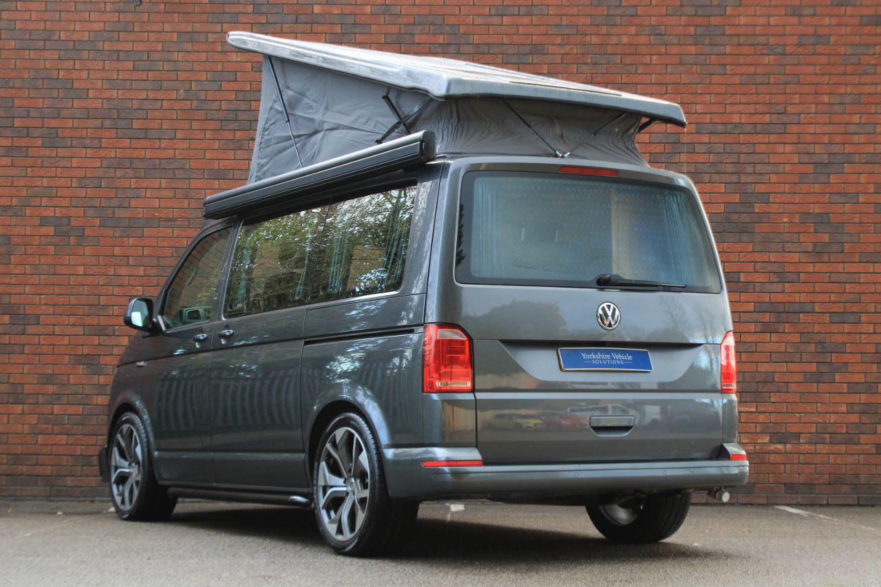 Finished in Indium Grey metallic with titanium black Simora cloth interior. Features include full Rolling Homes Columbus Campervan conversion, side kitchen layout with 4 berths/seats, deluxe SCA elevating roof, Fiamma wind out awning, handmade lightweight oak units with Corian work surfaces, 50 litre fridge freezer, twin burner hob with integrated sink, water tank and pump, 120Amp leisure battery for 12V fittings and ultra-low power LED lighting, RIB crash tested bed system, diesel blown air heating upgrade, blackout curtains and cab blinds, ultra slim 3mm solar panel 100 watt, 20” Audi RSQ8 style alloy wheels, swivel driver and front passenger seats with armrests, rear park distance control with rear view camera, air conditioning, Bluetooth connectivity with media streaming, DAB digital radio, automatic headlights with fog lights, auto-dimming rear view mirror with auto wipers, cruise control, heated front and rear windscreens, heated electrically adjustable exterior mirrors, sliding nearside rear door with soft close, lowered suspension by 30mm, Volkswagen bike rack & side bars, voice control, multifunctional leather steering wheel, automatic DSG transmission plus much more standard specification. This Transporter T28 Rolling Homes Campervan is offered in excellent condition having covered 61000 miles from new by its 1 former keeper. The van comes complete with a service history. NO VAT.