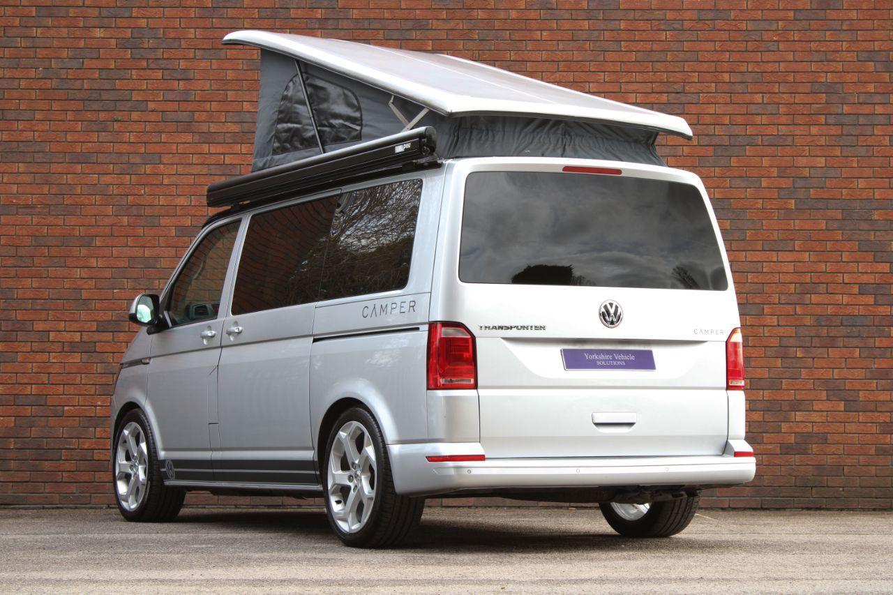 Finished in Reflex Silver metallic with black leather (front) and cloth (rear) interior. Features include a 4 berth capacity with a 2 berth pop up roof, Fiamma F45S side awning, 20” five split spoke ‘style 5084’ alloy wheels, Dometic refrigerator, Dometic sink and hob, captain front seats, rear park distance control, Audi S Line front sport seats with electric lumbar support, Bluetooth connectivity with media streaming, DAB digital radio, cruise control, daytime running lights, heated electric folding exterior mirrors, rear privacy glass, sliding nearside rear door, interior lighting, rear cab curtains, carpeted rear cab walls, fresh water pump, tailgate with window, 6 speed manual transmission plus much more standard specification. This Transporter Camper is offered in excellent condition having covered only 62600 miles from new. The van comes complete with a service history consisting of the following - 18/11/2019 at 16608 miles, 12/08/2020 at 36123 miles, 16/12/2020 at 44775 miles and 12/03/2024 at 56373 miles.